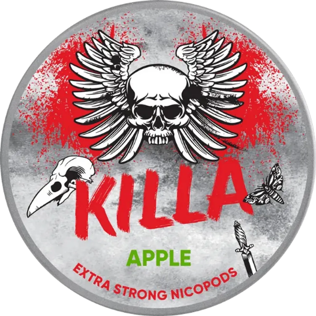 KILLA Apple Slim Extra Strong Nicotine Pouches - a clear and strong taste of apple. Contains an extra high content of nicotine, for a freezing rush. Snus completely free from tobacco.